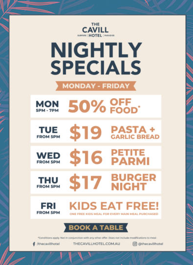Staying true to Cavill Avenue’s long-standing reputation as the live entertainment precinct of the Gold Coast. The Cavill Hotel emulates the personality of the iconic Surfers Paradise and specialises in creating memorable moments. With a relaxed and inviting atmosphere attracting beachgoers and locals alike, you’ll find The Cavill Hotel is the perfect restaurant in Surfers Paradise to dine, drink and play.